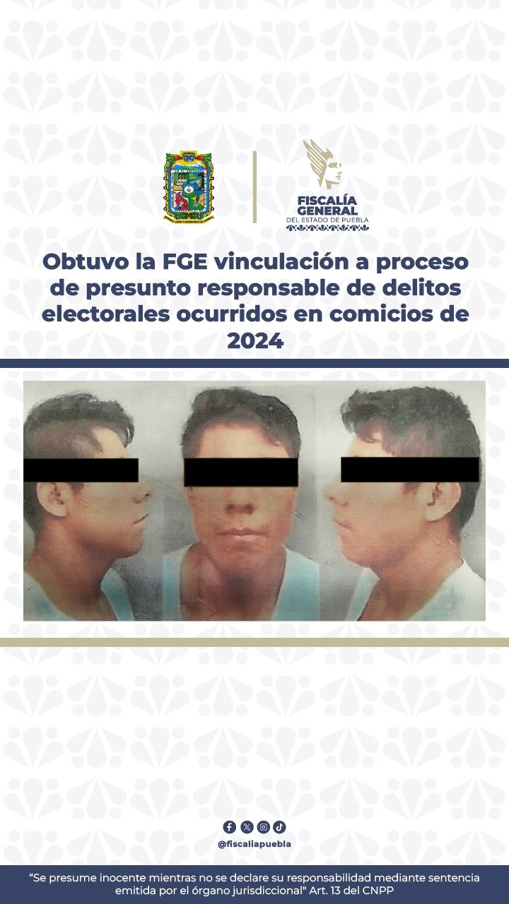 La FGE de Puebla dio a conocer que, conforme a los actos de investigación realizados, logró que un juez decretara la vinculación a proceso del imputado Santiago N., señalado por su probable participación en delitos electorales, relacionados con un evento ocurrido en la colonia Valle Verde, ciudad de Puebla, el 27 de mayo de 2024.